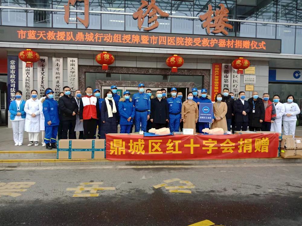 (鼎城区红十字会 贵文娟)日前,鼎城区红十字会在市第四人民医院举行捐赠仪式,向常德市蓝天救援队鼎城行动组和市四医院第一目击者行动联盟现场捐赠救援救护器材。区人民政府副区长杨俊,市红十字会专职副监事长王芬,市蓝天救援队副队长陈勇,区红十字会常务理事、区委组织部副部长刘克茗,区财政局副局长孙湘杰,区地震局局长刘辉,市四医院党委书记、院长陈祥出席,受赠代表近30人参加捐赠活动,捐赠仪式由区红十字会常务副会长王建民主持。